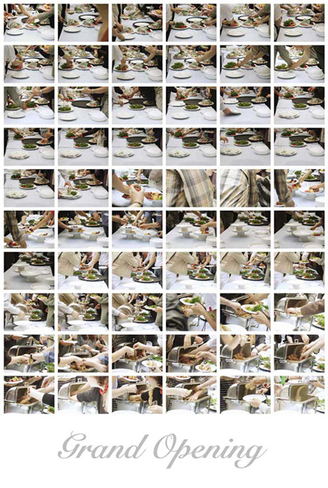 Fotoinstallation 60 C-Prints (je 10 x 15 cm) Plotterfolie 2010 Wie Stills aus einem Film dokumentieren die Fotografien wie innerhalb weniger Minuten das Eröffnungsbuffet der "1. Biennale for young art Moscow" abgeräumt wurde.