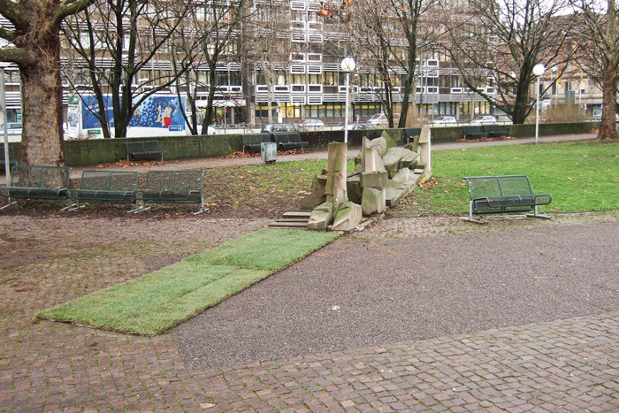 Die Fläche, die die Skulptur »Fluss der Zeit« des Bildhauers Voré auf dem Rasen einnimmt, wird in Verlängerung des »Flusses« auf dem Platz vor dem Badischen Staatstheater Karlsruhe mit Rollrasen gespiegelt.