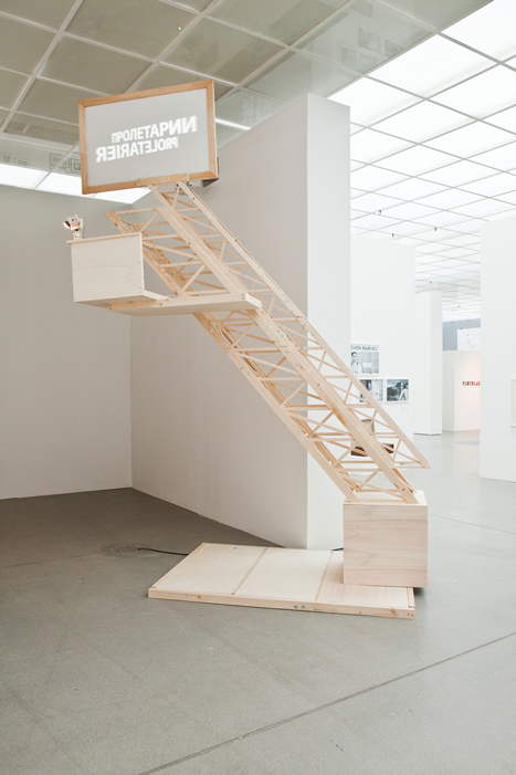 Das Zentrum der Installation ist der verkleinerte Nachbau der Lenin-Tribüne nach einem nicht realisierten Entwurf von El Lissitzky aus dem Jahr 1920. Anstatt des Redners Lenin befindet sich auf der Plattform der Tribüne eine Art Suchscheinwerfer. Dessen Kegel irrlichtert durch den Raum und bleibt dabei immer wieder an Einzelelementen eines Wandbildes hängen.