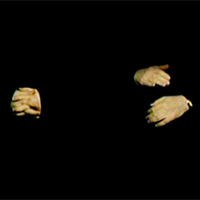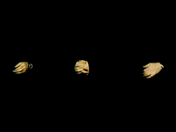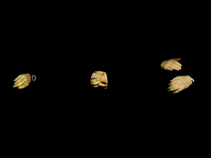 Die Videoprojektion ist in drei Bereiche geteilt, der gesamte Hintergrund ist schwarz. Im Mittelteil sind zwei gefaltete Hände zu sehen, links und rechts je eine offene linke Hand; insgesamt also vier Hände, die fünfte wird zunächst nur vom Titel der Arbeit: »Die fünfte Hand« versprochen. Die Hände schweben, ohne an einen Körper gebunden zu sein, auf der schwarzen Projektionsfläche und beschreiben schwache, sich wiederholende Bewegungen.