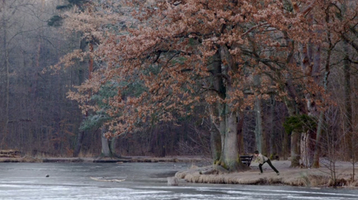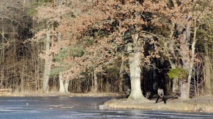 Eine Joggerin vollführt unaufhörlich Dehnungsübungen in einer Landschaft mit See.